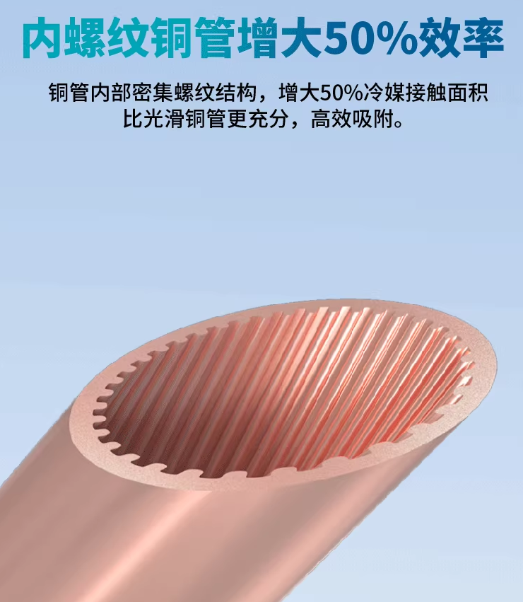 銅管內部密集螺紋結構,增大50%冷媒接觸面積比光滑銅管更充分,高效吸附。加厚銅管,壁厚0.8(這里加粗),真材實料,使用壽命長,更適合復雜工況。